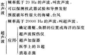 [小结]声波是纵波,可闻声波的频率范围是20Hz~20000Hz.低于20Hz的声波为次声波,高于20000Hz的声波为超声波。超声波和次声波虽不能引起人的听觉,但不仅具有波的一切特性,还具有它的一些特性.在生产技术和科研中有着重要作用.