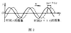 波的图象表示介质中各质点在某一时刻(同一时刻)偏离平衡位置的位移的空间分布情况。在不同时刻质点振动的位移不同,波形也随之改变,不同时刻的波形曲线是不同的。图2表示经过丛时间后的波的形状和各质点的位移。