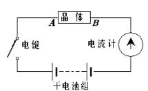 实验3:将方铅矿石晶体,灵敏电流计,干电池,电键连接成简单的串联电路(如图),先让矿石 A端和电池正极相连接。然后把矿石掉个头,B端跟电池正极相连接。观察两次通电时电流计的读数。