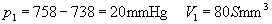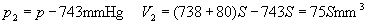 例题 一水银气压计中混进了空气,因而在27℃,外界大气压为758毫米汞柱时,这个水银气压计的读数为738毫米汞柱,此时管中水银面距管顶80毫米,当温度降至-3℃时,这个气压计的读数为743毫米汞柱,求此时的实际大气压值为多少毫米汞柱?