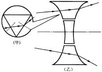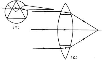 讲解凸透镜和凹透镜对光的作用,除按照教材要求进行实验,通过实验取得丰富的感性知识外,还可以利用光的折射的初步规律,参照下图来进行分析.当一条平行于玻璃三棱镜底边的光由空气射入玻璃时,折射光线靠近法线折射.光进入玻璃以后又从玻璃射入空气中,发生第二次折射,这时折射光线将远离法线折射,两次折射的折射光线都由玻璃三棱镜(透镜)薄的位置向玻璃三棱镜厚的部分倾斜,因此可以分析出凸透镜对光会起聚作用.如上图(乙)