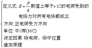 a、定义:放入电场中某一点的电荷受到的电场力跟它的电量的比值叫该点的电场强度,简称场强.