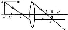 平行于主轴的光线被凸透镜折射后经过焦点,通过焦点的光线被凸透镜折射以后平行于主轴射出,两条折射光线在透镜另一侧1倍焦距与2倍焦距之间的位置相交于一点,AB发出的无数条光线经透镜折射后组成了AB的像