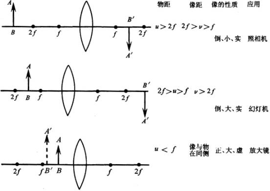 研究物体位于1倍焦距与2倍焦距之间(画出板图)、位于焦点以里(画出板图),两个位置凸透镜的成像情况(包括像的位置,像的性质(指像与物比是放大还是缩小、像是倒立还是正立,是虚像还是实像)).我们用u来表示物体到透镜的距离,用v表示像到透镜的距离、f表示焦距.