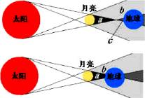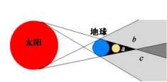 (1)日食:发生日食时,太阳、月球、地球在同一条直线上,月球在中间,在地球上月球本影里的人看不到太阳的整个发光表面,这就是日全食,如a区.在月球半影里的人看不到太阳某一侧的发光表面,这就是日偏食如b区,在月球本影延长的空间里的人看不到太阳发光表面的中部,能看到太阳周围的发光环形面,这就是日环食,如c区.