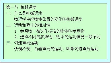 观察一些实例,可以提供录相和视频文件、图片让学生思考这些运动的特点,对于基础较好的学生,可以由他们发现其中的共性,总结出匀速直线运动的特点.讲解时,要注意匀速解释成快慢不变,而不要引出速度的概念,使学生形成对匀速的感性认识,并说明匀速直线运动是最简单的机械运动,而物理研究问题是从最简单的问题入手的.