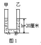 如图1所示的容器,甲、乙两管横截面积相等,等于1厘米2,内装水,水面到容器底部的距离为20厘米,问:A、B两处受到的压强各是多大?