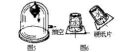 【演示4】取下钩码,将合紧的皮碗挂在真空罩内抽空,(如图5)皮碗自动脱落.