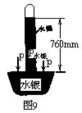 让学生注意观察,玻璃管倒立在水银槽内后,水银柱的变化是:先下降,达到一定的高度后停止下降,由管侧的刻度尺读出管内外水银面的高度差约760mm.(如图9)