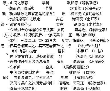 注:讲大纲要求掌握的常用词“朝、孰、诚、方、善、间”用幻灯打出这些常用词在初中使用过的句子,并注明出处,让学生快速回答。