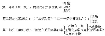 第三部分(第三段至第五段),根据梁惠王有探求如何使“民加多”的心理,以及战国时国君所有的“统一天下”的宏愿,孟子提出自己的“仁政”主张。