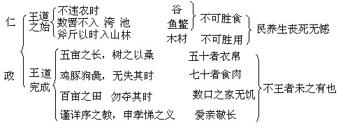“五亩之宅,树之以桑,五十者可以衣帛矣。鸡豚狗彘之畜,无失其时,七十者可以食肉矣。百亩之田,勿夺其时,数口之家,可以无饥矣;谨庠序之教,申之以孝悌之义,颁白者不负戴于道路矣。七十者衣帛食肉,黎民不饥不寒,然而不王者,未之有也。”这一段与前文“王道之始”呼应,深刻阐述了“王道之成”的道理,为梁惠王描绘了一幅生动、形象、美好的社会前景。在孟子看来,理想的治国策略必须具有几个不可或缺的要素:第一,要有众多的人口,要积极努力“使民加多”,否则治国必需的物质财富和守卫力量便无从获得;第二,要恢复发展生产,繁荣经济,减免赋税,实行井田制,使百姓有固定的“恒产”,恤民保民,休养民力,使人民富裕起来,丰衣足食,安居乐业,否则国家便无从获得可以不断发展的生产力以保证富强,因为民穷财尽是不能治理国家、保住政权的;第三,当权者要“以不忍人之心,行不忍人之政”,以“仁德”行“仁政”,以仁义治天下,以德去引导,以礼去规范,选贤任能,宽省刑罚,博施广济,缓和社会矛盾,节制统治阶级的穷奢极欲,推恩于民,施惠于民,与民同乐,使天下归心,否则便无从获得强国富国的坚定保障和政策后盾;第四,发展文化,普及教