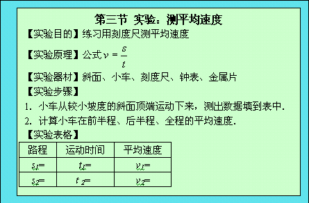 测量平均速度的原理、实验器材可以让学生说明,指出长度、时间的测量可以用测量工具直接测量,而速度测量需要测量长度和时间再根据速度公式计算,所以实验原理是速度的公式
