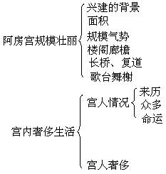 a.过渡:在第—段中,作者从背景、外貌、内景等方面极力铺陈,阿房宫的形象已矗立于眼前,富丽堂皇。在本段中,由宫殿的描绘,自然过渡到对宫人、宫藏的描绘。