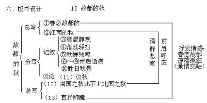 1.“北国的秋,却特别的来得清,来得静,来得悲凉。”“清”“静”“悲凉”是故都的秋的特点。这是课文的主线或文眼。对课文文眼或主线的把握有利于我们对课文的深入理解。如:《荷塘月色》中“这几天心里颇有点不宁静”《绿》中的“惊诧于梅雨潭的绿了”。