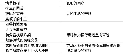 要注意引导学生用相同的句式来概括同一表现内容的情节,比如“人民生活苦难”部分用名词性词组,而“黑暗势力横行”部分则用主谓短语,第三部分则是用对仗的句式。
