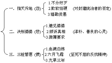 本折戏由三个部分组成。第一部分是窦娥谴责天地鬼神,第二部分是窦娥与婆婆诀别,第三部分是窦娥发下三大奇愿。这三部分有张有弛,疏密相间,富有鲜明的艺术节奏。一开幕刽子手摇旗提刀,监斩官厉声吆喝,再配上缓慢沉闷的锣鼓声,舞台一片阴森紧张的氛围。窦娥披枷戴锁登场,呼天抢地的悲诉怒斥,更加重了悲剧气氛。眼看窦娥就要成为刀下之鬼,观众的心绷得紧紧的。然后作者却宕开一笔,转人第二部分婆媳诀别。窦娥哀怨低回的身世之叹与第一部分高亢激昂的斗争精神形成鲜明的对比,展示了她内心世界的另一面,催人泪下,感人至深。剧情发展明显有一顿,形成一张一弛的戏剧波澜。这一“弛”为下一“张”蓄势,从而转入全剧的高潮,真是跌宕多姿,匠心独运,具有极强的艺术感染力。结构如图: