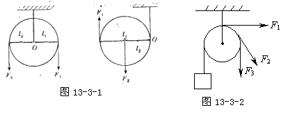从杠杆平衡角度分析:用弹簧测力计测拉力的大小分别沿竖直向下方向拉、水平横拉、斜拉时均是等臂杠杆,因此,使用定滑轮与不使用定滑轮而直接用手去提拉,用力的大小是相等的,即使用定滑轮不省力.如图13-3-2.