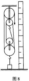 【实验3】实验装置如图8所示(滑轮组旁立着一个直尺).请学生观察钩码上升1个格时,绳子的自由端下降了几个格.以此验证学生的推论.