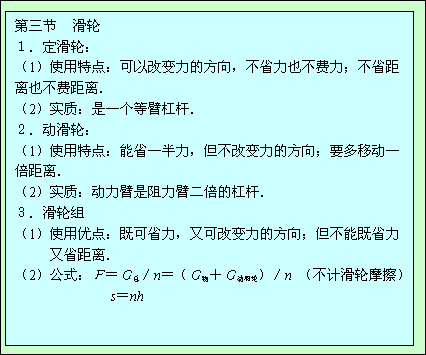| 特点 | 能改变动力的方向但不省力 | 能省一半但不能改变力的方向 | 用几段绳子吊着物体,所用力就是总重的几分之一 |