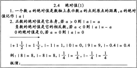 【教法说明】这一环节是对绝对值的几何定义的巩固.这里对于绝对值定义的理解不能空谈“5的绝对值、-7的绝对值是多少”?而是与数轴相结合,始终利用表示这数的点到原点的距离是这个数的绝对值这一概念.教师先阐明