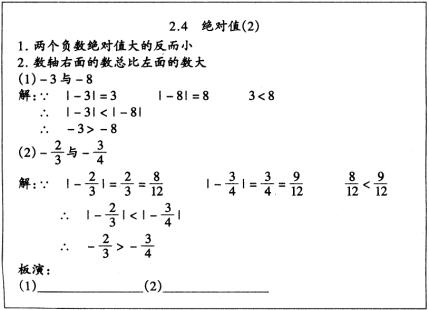 【教法说明】(1)题是为了分散利用绝对值比较两个负分数的大小这一难点埋下了伏笔,在这个题目中用最简单的“∵,∴”的形式训练学生简单的推理能力.(2)题是复习利用数轴比较两个数的大小,让学生体会出这四个题中觉得难度较大的题目是最后小题两个负数比较大小,从而引出课题.