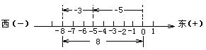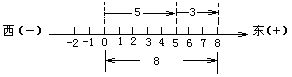 从数轴上表明,两次行走后在原点0的西边,离开原点的距离是8米.因此两次一共向东走了-8米.
