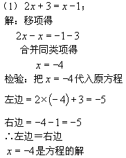 【教法说明】通过以上两题进一步印证移项这种变形的规律,即“移项要变号”.要使学生认清这里的移项是把某项从方程的一边移到另一边而不是在同一边交换位置,弄懂解方程的书写格式是方程在变形,变形时保持“左右两边相等”这一数学模式.