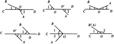 【教法说明】本组题目是巩固对顶角概念的,通过练习,使学生掌握在图形中辨认对顶角的要领,同时又用反例印证概念,使学生加深印象,最后一个图形为下面讲部补角做铺垫。