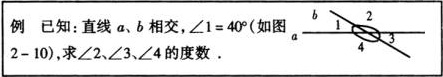 【教法说明】例题一方面巩固了对顶角的性质;另一方面说明几何里的计算题,需要用到图形的几何性质,因此,要有根有据地计算.例题放手让学生自己解决,比教师单纯地讲解效果会更好.尽管学生书写格式不如课本上的规范,但通过集体讲评纠正后,学生印象更深刻.