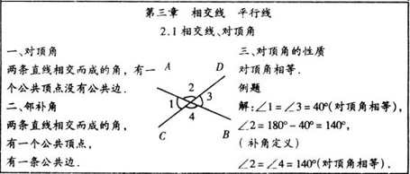 【教法说明】推得“对顶角相等”这个结论的过程,是课本中初次出现的一步推理,使学生了解推理可以写成“∵……∴……”的形式,并且每一步都要有根据,也就是括号里填的理由.这种推理的格式以后还要逐步渗透和训练,现在不要求自己会写推理过程,只要求学生能看明白就可以了,为以后证明打好基础。