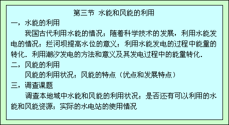 教学方法同上,针对基础较好的学生可以由学生提供关于风能的利用的资料(这是在上一节课应当布置的课题),学生提供的资料可以由班级共享.对于一般的教学过程,可以提出思考问题:风能的利用状况;风能的特点(优点和发展特点)等.