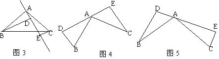 (3)若直线AE绕A点旋转到图5时(BD>CE),其余条件不变,BD与DE、CE的关系怎样?请直接写出结果,不须证明
