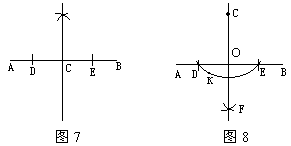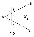 分析:现在要寻找“经过直线外一点作这条直线的垂线”的方法,能利用角平分线的作法吗?如图6,用直尺和圆规作∠AOB的平分线OF,如果画出直线DE,那么∠AOB的平分线OF与直线DE垂直吗?为什么?