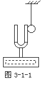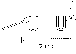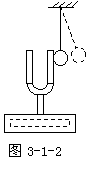 如图3-1-1,将没有敲响的音叉靠近并接触乒乓球,球不弹起.敲响音叉,缓慢移近并接触乒乓球,叉股将悬吊在铁架台上的乒乓球弹开,如图3-1-2.