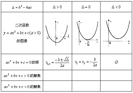 它是我们今后求解一元二次不等式的主要工具。应尽快将表中的结果记住。其关键就是抓住相应二次函数