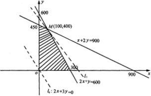 作出可行域,如图阴影部分,且过可行域内点M(100,400)而平行于