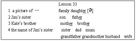 利用准备好的Jim’s Family Tree图表投影片,边指图表边示范介绍表示家庭成员关系的生词:family brother sister father mother son daughter mum dad grandfather grandmother wife husband. 并在此过程中介绍名词所有格、,然后引导学生进行操练。