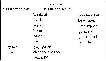 2.用59课的课件或图片复习句型:It’s time to/for 及59课的动词短语。