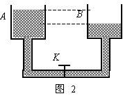 如图2,两个玻璃杯容器底部用一根软胶管相连,中间用卡子卡住,两边的水面不相平,当把卡子打开后,看到水从A容器流向B容器.A、B容器水面相平后,水停止了流动.由此说明水面的高度差是使水定向流动的原因.