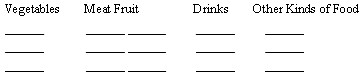 The Ss work in groups. They have to write down the names of as many items of food as they can think of in English. See which group can write down the most items for each category.