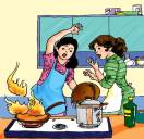 1) cooking in the kitchen; 2) the pan of oil; 3) catch fire) 4) turn off the gas; 5) cover the pan; 6) the fire (be) out
