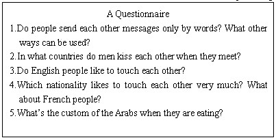 T: Now we know different people have different ways of making communication? through body language. And not all the body language means the same thing in different cultures. Please read the text again, then fill in the blanks of the table.