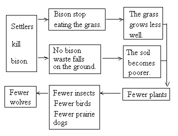 Read aloud the two questions. Then tell the Ss to read the passage quickly and write down the answers to the questions. Allow the Ss enough time to read the text, write down the answers and compare them in pairs. (1 The settlers killed them, forced them to leave their hunting grounds, broke agreements which they had made, forced them onto poor land, and killed most of the bison on which Native Americans had relied for food. 2 The killing of large numbers of bison changed the whole wildlife chain on the plains.)