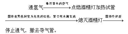 【实验3-8】在干燥的硬质试管底部铺一层黑色的氧化铜,管口微向下倾斜。通入氢气,过一会儿再给氧化铜加热。注意观察黑色的氧化铜有什么变化,管口有什么生成。反应完成后停止加热,还要继续通入氢气,直到试管冷却后,再停止通氢。