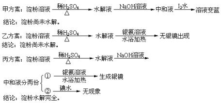 乙方案操作错误,结论亦错误。淀粉完全水解后应用稀碱中和作为催化剂的酸,然后再作银镜反应的实验,本方案中无银镜现象出现,可能淀粉尚未水解,也可能淀粉水解完全或部分水解。