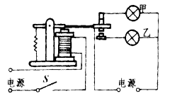 分析:开关S闭合后电磁铁有了磁性就把衔铁吸引下来.结果是甲灯不亮,乙灯亮了. 此题应选(B).