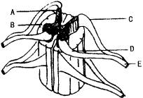 (3)与脊髓灰质相联系的有两种神经:C和D,C由_________纤维构成,其功能是将神经冲动从_________向_________传递;D由_________纤维构成,其功能是将神经冲动从_________向_________传递。C和D在_________处合为一条E。