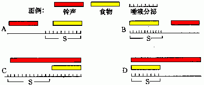 解析:这是1991年高考试题。建立条件反射时,是让无关刺激(铃声)与非条件刺激(食物)多次结合,最后形成对铃声发生唾液分泌的条件反射,此时的铃声称为条件刺激。A图给铃声不分泌唾液,给食物才分泌唾液,说明铃声还不是食物的信号,是与唾液分泌无关的无关刺激,所以A图S段的唾液分泌还是非条件反射。B图先给食物,出现唾液分泌,然后停止喂食只给铃声,则不分泌唾液。说明条件反射并未建立,铃声仍为无关刺激。所以B图S段的唾液分泌是非条件反射。D图铃声和食物同时出现,则分泌唾液,单独给铃声时,则不分泌唾液,说明条件反射未建立,所以D图S段的唾液分泌也不是条件反射。C图出现铃声就分泌唾液,铃声已成为条件刺激,所以C图S段的唾液分泌属于条件反射。