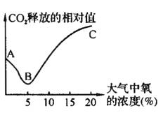 (2)由A点到B点,氧气浓度逐渐上升,到B点时,氧气浓度大约达到3%水平,而无氧呼吸会受到氧气的抑制而减速,但对有氧呼吸而言,B点的氧浓度又过于低了,有氧呼吸的速率也很低,因此从A点到B点的过程中,由于无氧呼吸与有氧呼吸的水平均较低,因此二氧化碳的释放量急剧减少。